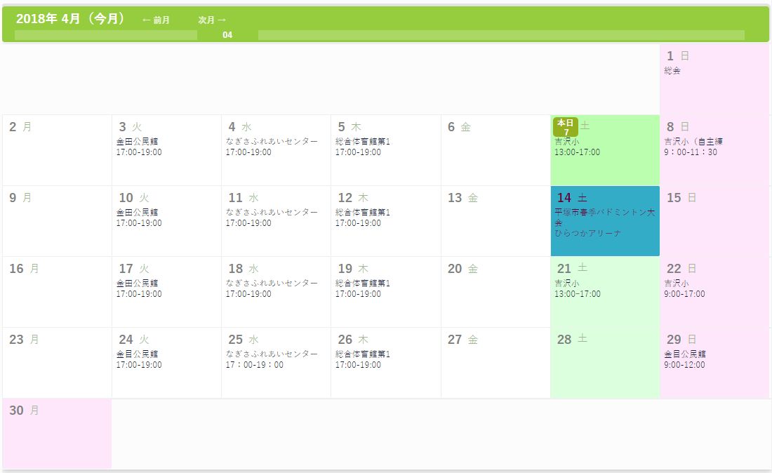 下は4月7日時点の予定であり、最新ではありません。 土日がまだ未確定ですが決定次第追記します。 ------------------------------------------------------------------- 4/7 土曜日 吉沢小 13:00-17:00 追加 4/14 土曜日 平塚市春季バドミントン大会 追加 4/3 11時 更新@ -------------------------------------------------------------------- 4/8 9:00-11:30 吉沢小(自主練 4/21 吉沢小 13:00-17:00 4/22 吉沢小 9:00-17:00 4/25 なぎさふれあいセンター 17:00-19:00 4/29 金目公民館 9:00-12:00 4/7 17時 更新@ ------------------------------------------------------------------------- 仮ですが5月分も上げておきます。 CommentsComment Form |