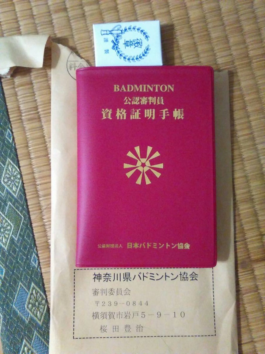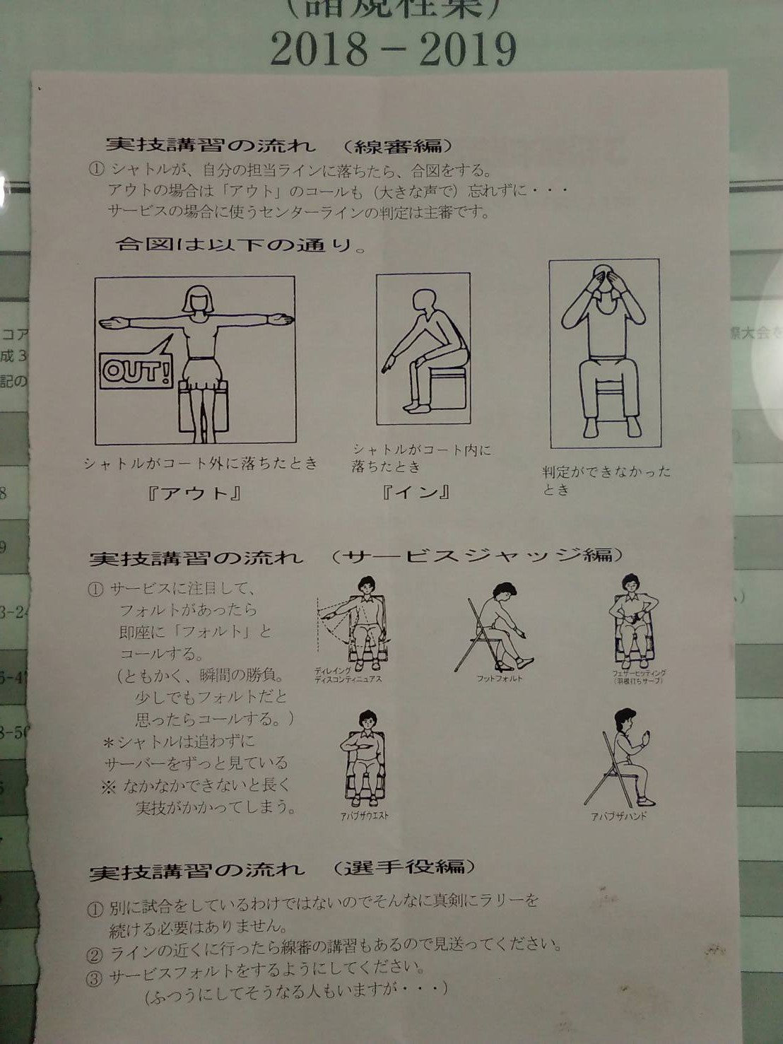 年齢層はやや高めで平均年齢40-50歳てとこでしょうか。 女性がやや多かったと思います。有名ジュニアチームの保護者の方もいました。 受付で参加票と9,000円(お釣りのないように!)を渡して 競技規則書、サービスや線審のフォルトの種類や ジェスチャーの用紙をもらって講義開始。 講義をしてくださったのは学校の先生のようで 退屈せず3時間があっという間でした。 ここでしっかり話を聞いていればテストは大丈夫だと思います。 テストに出るところをここ覚えておいてくださいと教えてくれます。 テストは正誤答式ですが、合っているものにはA 間違っているものにはBを記入するという若干めんどくさい 仕様でした。50問中40問正解で合格です。 不合格でも追試という形で対応してくれるようです。 幸いうちの会場では不合格者はいませんでした。 合否については口頭で、結果は一切公表されないとのことでした。 ここで実際に出た問題。 Q1.自コート内でシャトルを打った後それを追ってラケットがネットを超えたためフォルトのコールをした。 Q2.プレイヤーに著しく不品行な振舞いがあったので主審はその場でプレイヤーを失格とした。 答えは両方共誤っているです。 A1. 第13条4項2 ラケットや身体がネットを超えればオーバーザネットでフォルトですが、「打ち終わった後シャトルを追ってラケットがネットを超えるのはやむをえない。」となっています。 A2. 第16条7項2 主審は失格にできる権限を持っていませんのでまずはレフェリーに報告します。 で、昼ごはんを食べた後体育館に移動して実技講習です。 10-12名で1グループになり、決められた順番でプレイヤーや審判をしていきます。 1ゲーム7分くらいでストロークは6回まで、 ライン際のシャトルは打たない、わざとサービスフォルトをするなどの 指示がありました。 一番びっくりしたフォルトは私がサービスジャッジに入っているとき サーバーを注視していたら、レシーバーがドドドドドdと足音を立て 走り出したときです。音にびっくりしてフォルトのコールが遅れました。 私がしたのは線審中に目の前にシャトルが落ちたのにアンサイトのジェスチャーをして 主審を困らせたり、隣のコート端にシャトルを打ち込んだくらいです。 和気あいあいと進むのでラケット持ったことがなくても大丈夫です。 実技講習終了後、講評、片付けをして解散です。 暗転~~ 日を改めた実技試験は実際の大会で行われます。 今回は混合ダブルスの大会だったので、名前を覚えなくても安心でした。 4人のグループに分かれて主審、線審2名、得点板係をローテーションしていきます。 選手はこっちの都合なんか関係なく、ライン際にバシバシ打ってきます(笑) 実技試験の講評として ・声が小さくて聞こえない人がいた。 ・勝手に休憩を取るプレイヤーには警告をしてください。 ・得点板係が主審のコールを待たずにめくっていた。(私です) などのお言葉を頂戴して全員合格を頂きました。 この後3~4ヶ月後に審判手帳とバッジが送られてくるそうです。 更新までに最低1回は審判として大会に参加してくださいとのことです。 11月下旬に届きました。 以前は申請を忘れてて半年かかったケースもあるようですが 今回は2ヶ月足らずで届きました。 CommentsComment Form |
